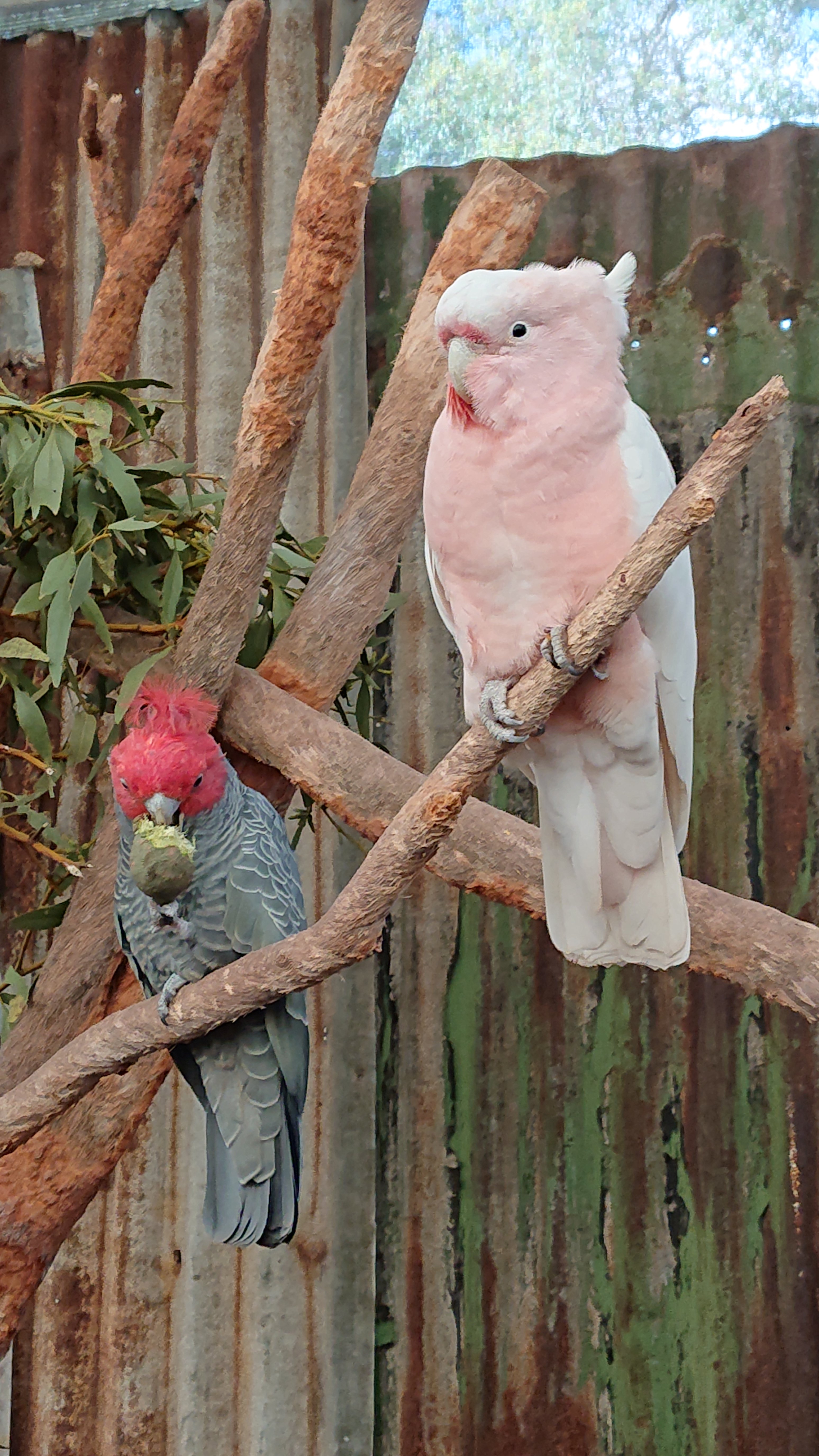 Gang-gang cockatoo (Callocephalon fimbriatum, left) and pink cockatoo (Lophochroa leadbeateri, right). They hold a fruit when they eat it.I feel Gang-gang cockatoo has a funny name.