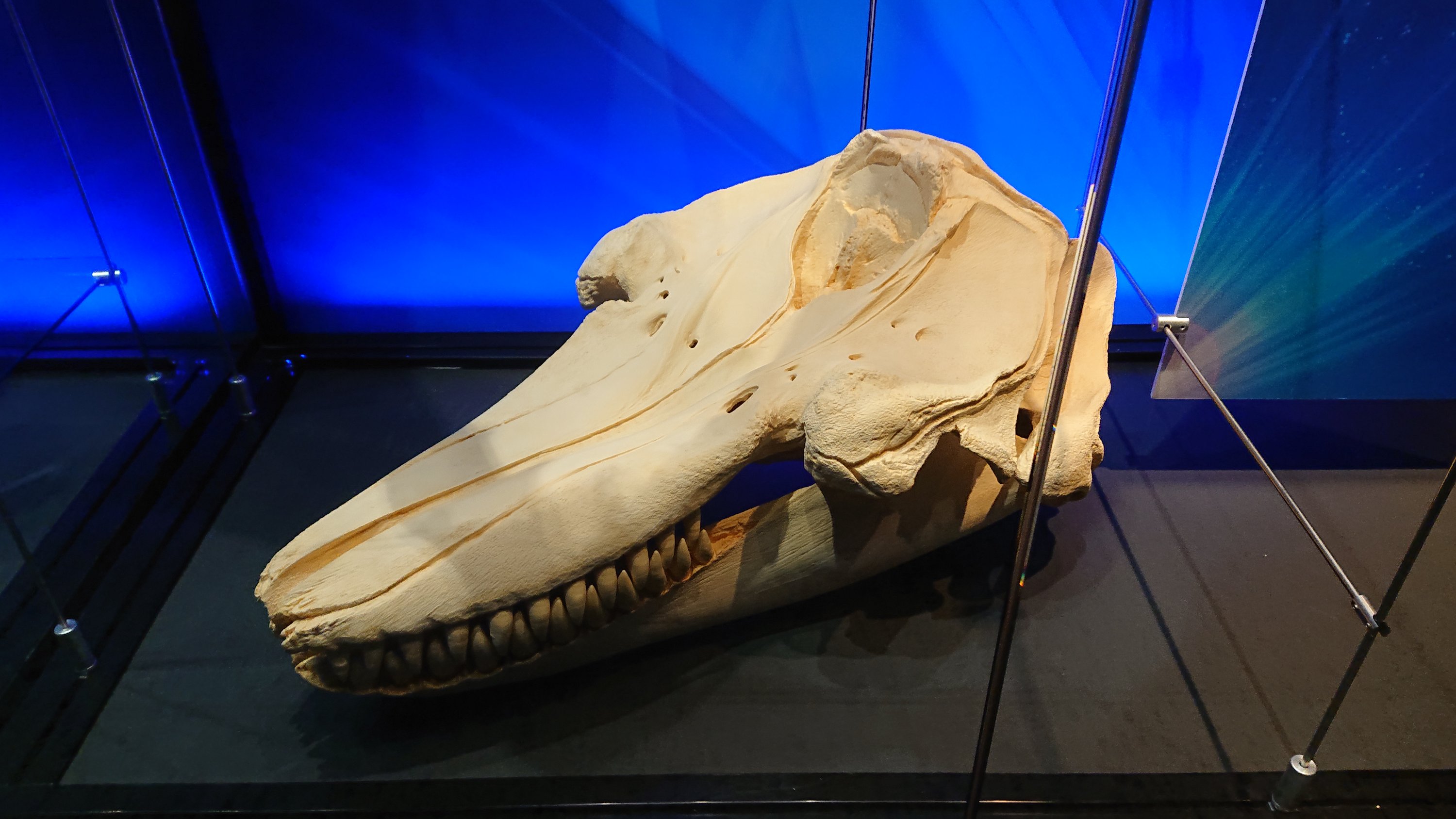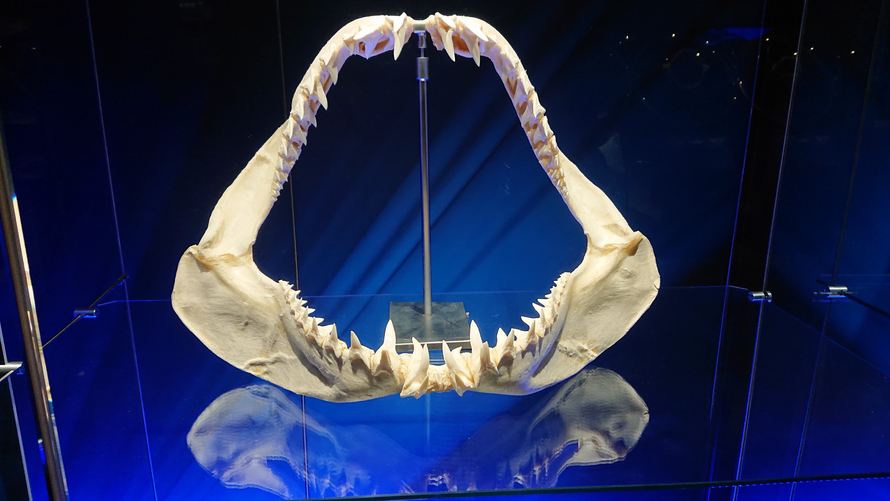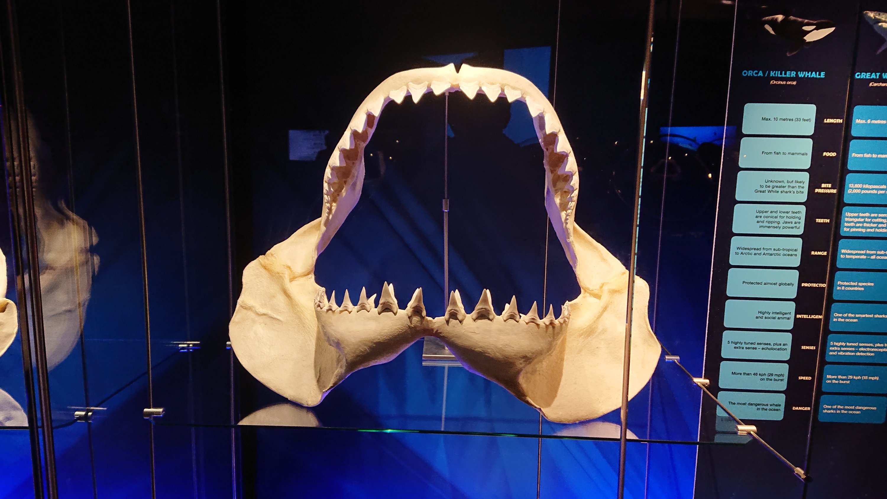 Skull of killer whale (Orcinus orca) for comparison with the jaw of great white shark. He has scary teeth like piles.