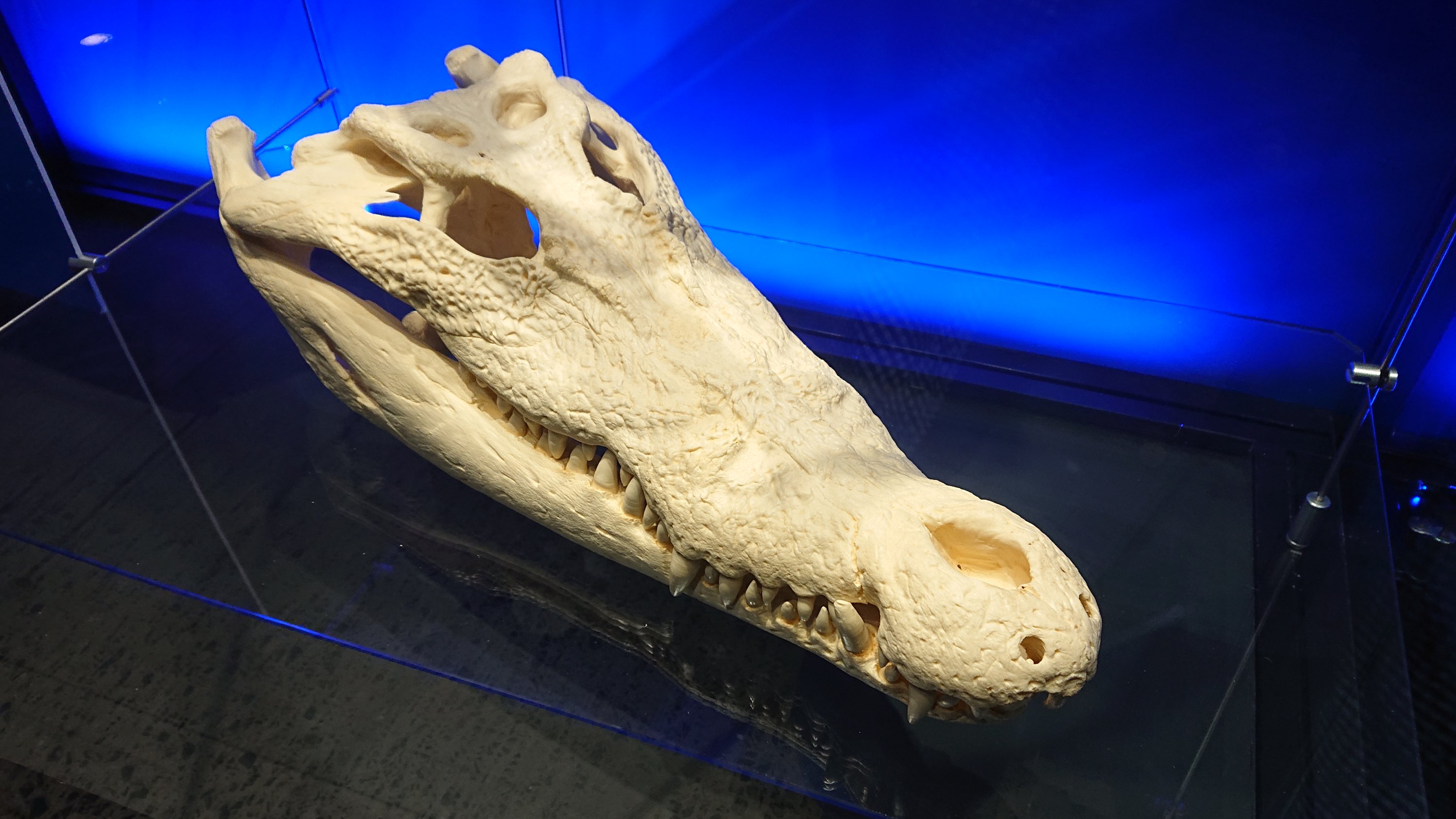 Skull of saltwater crocodile (Crocodylus porosus) for comparison with the jaw of bull shark. It is the biggest crocodile in the world. Nerves for current sensors were in the pits around his nose.