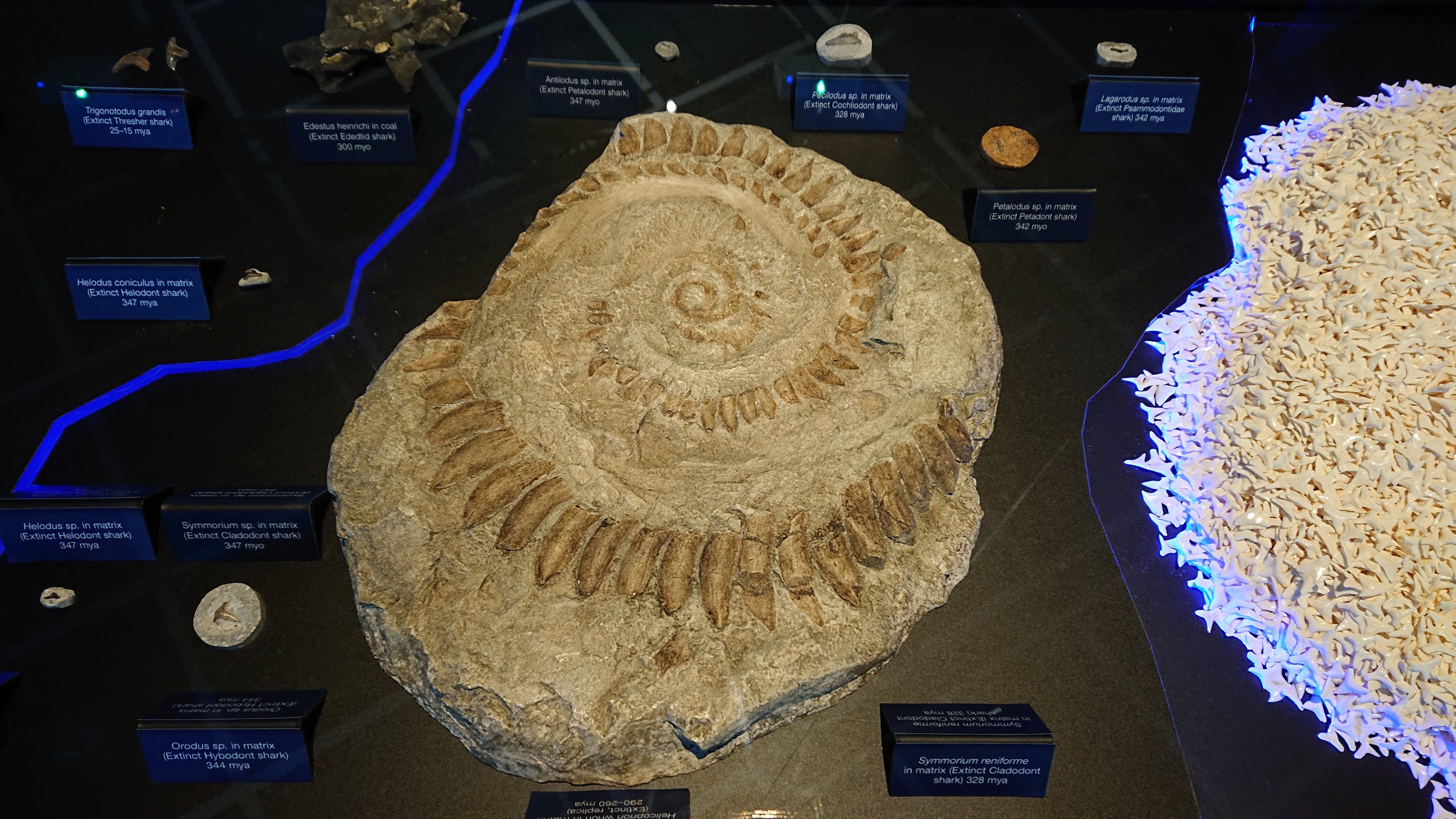 Helicoprion is popular for its coiled row of teeth, but no one had known where and how they had been when he had lived for long time. But in 2013, a research showed that they had been in lower jaw like a circular saw. It is said that these teeth are used for slashing his prey like nautiluses or ammonites.