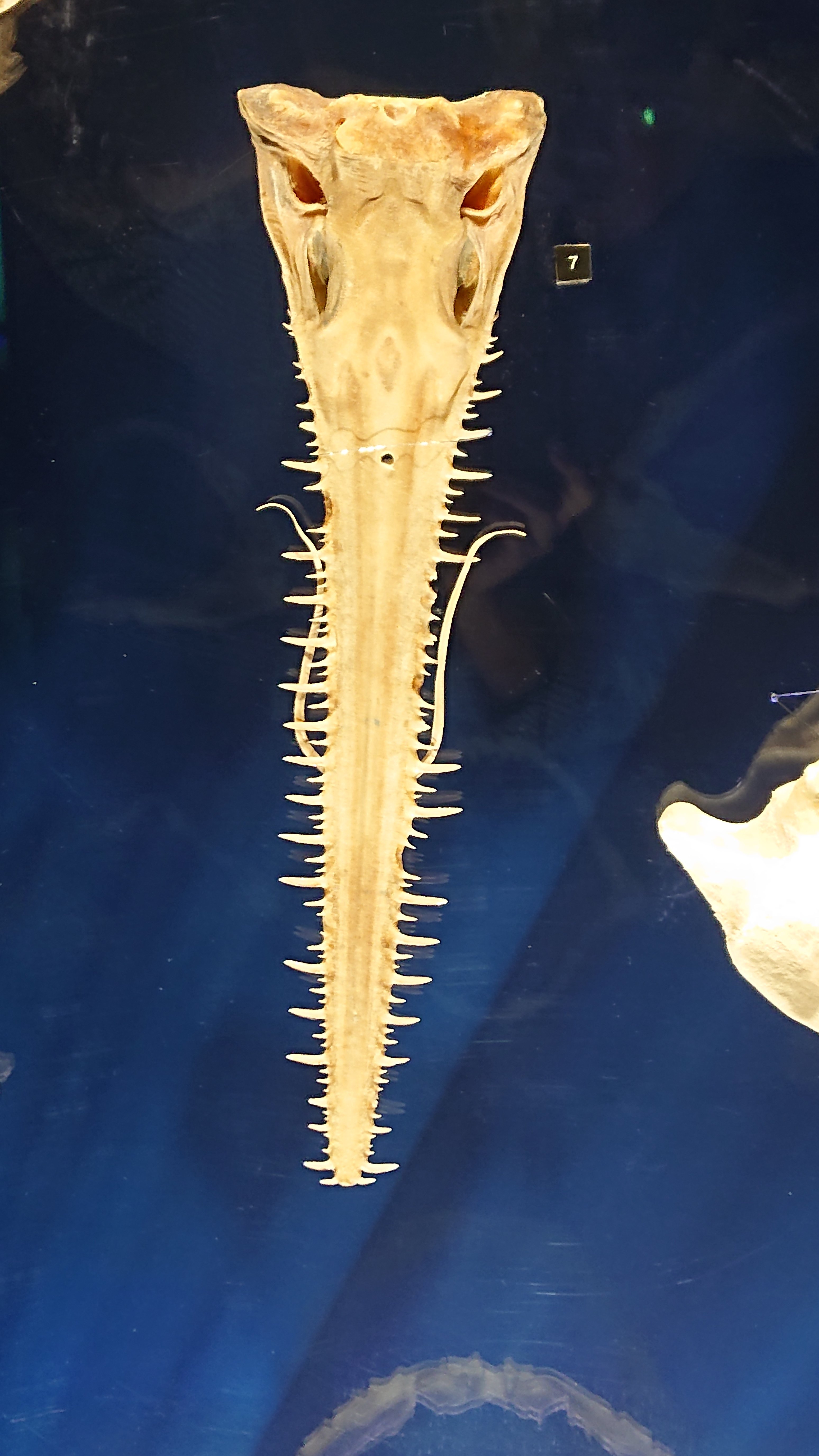 Sawsharks and sawfishes have quite similar not only figures but also behaviors. Both of them uncover sand on the seabed with their ” saws” to search their food. The most different point is position of their gills. Sawsharks’ gills are side of their body. On the other hand, sawfishes’ gills are underside of their body.