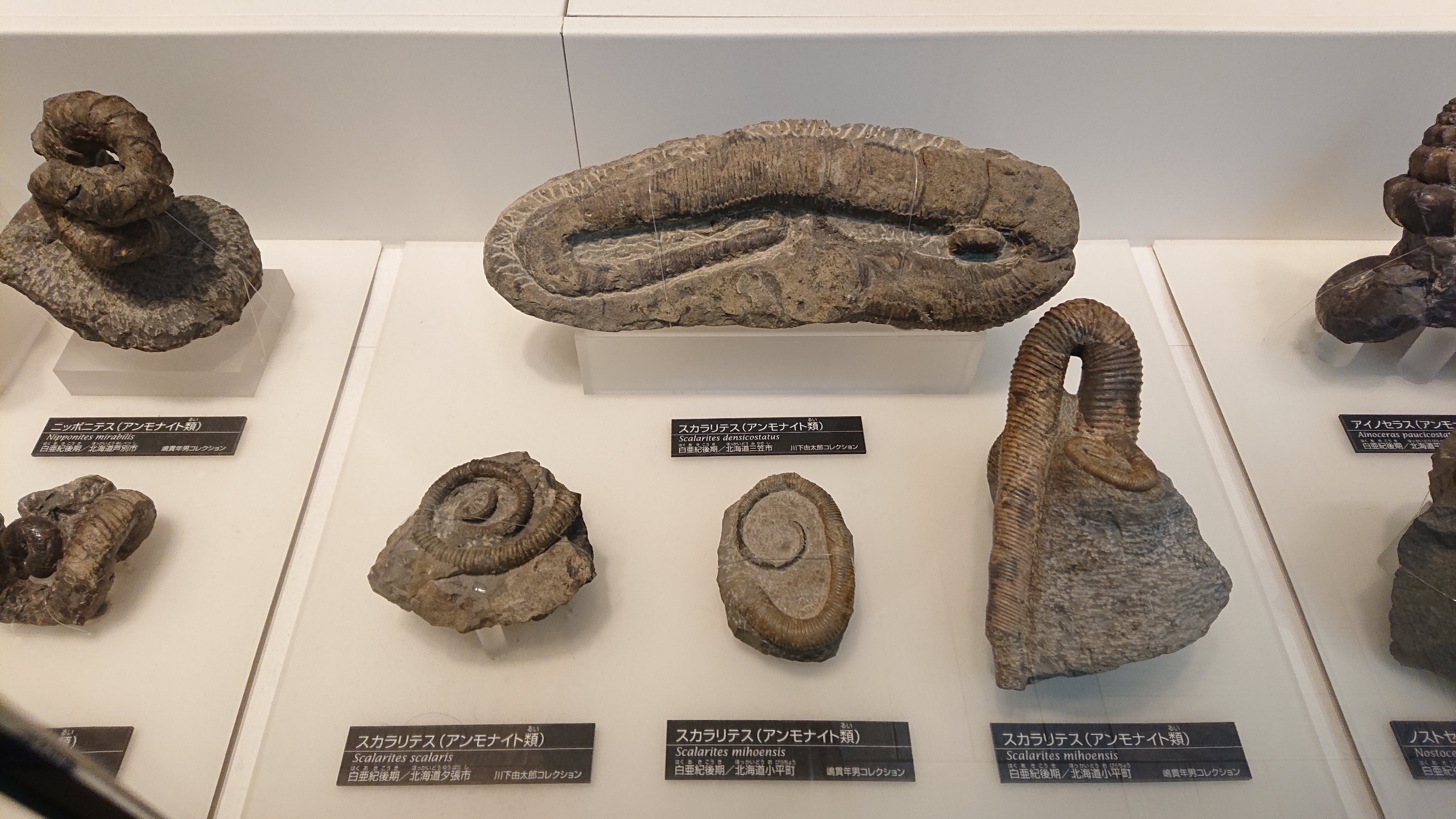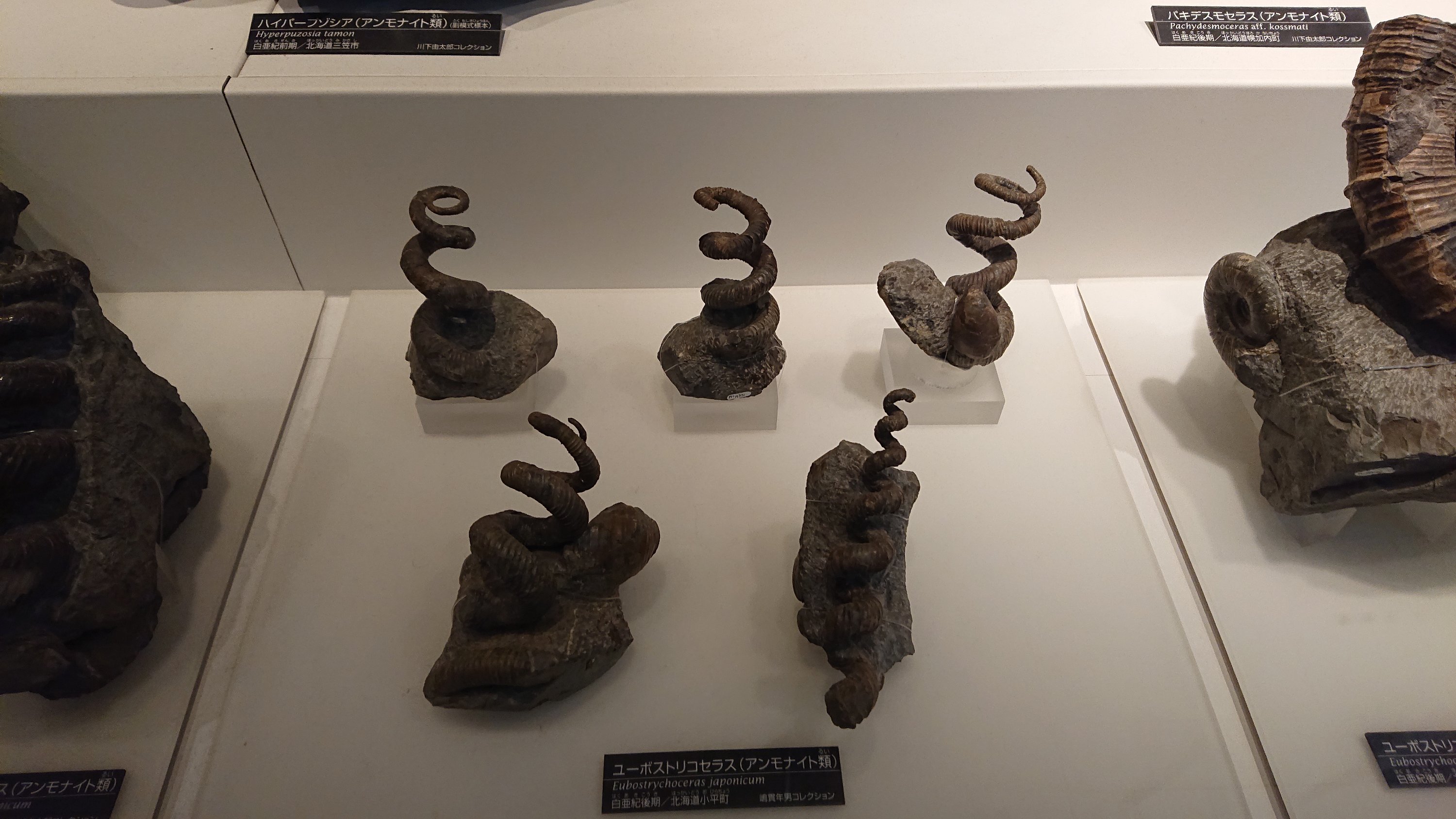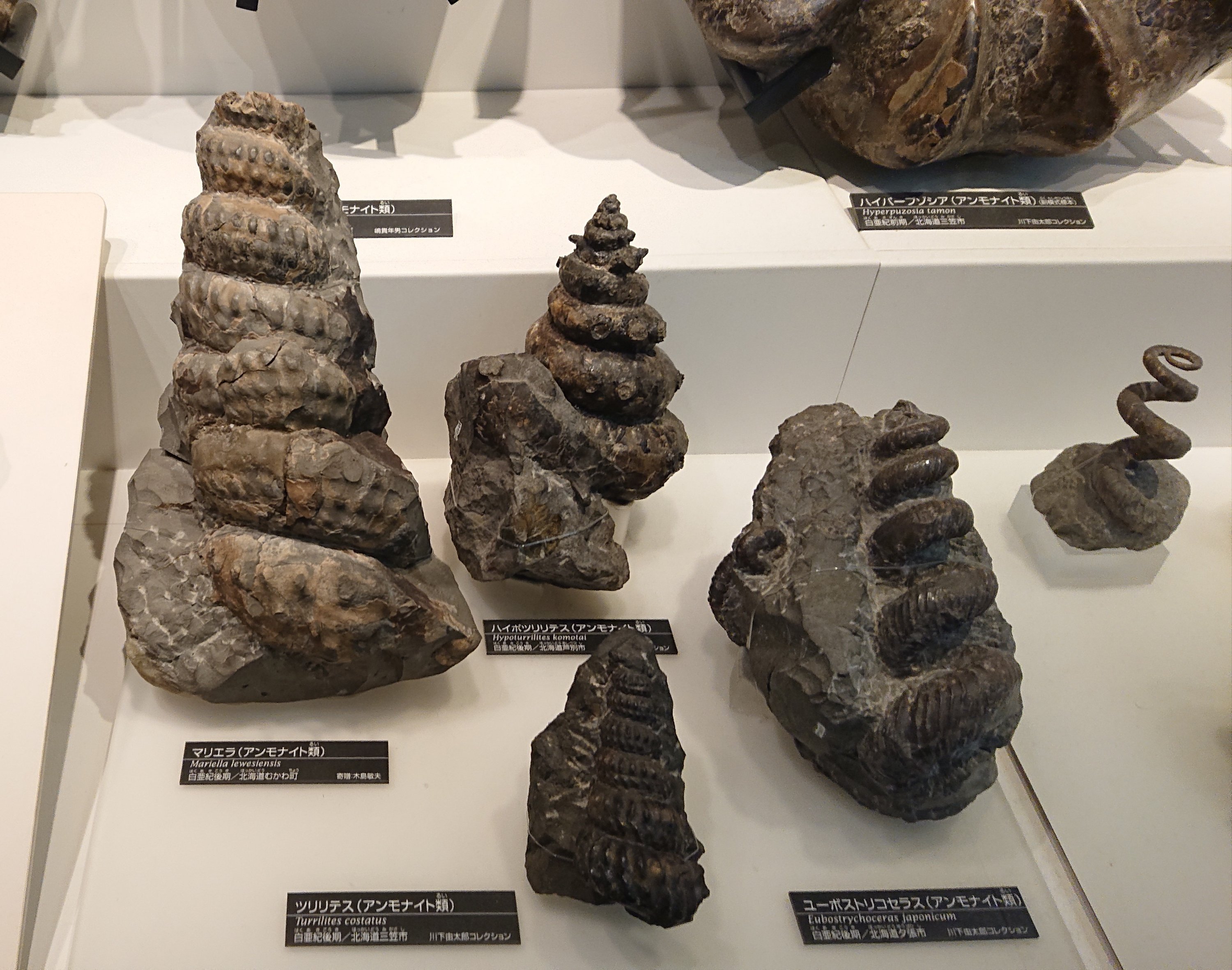 “Unusually coiled ammonites” lived in Late Cretaceous, about 100 to 66 million years. ago. They are mainly found in Yezo Group, the strata in Hokkaido, and Izumi Group, the strata between Osaka and Ehime.